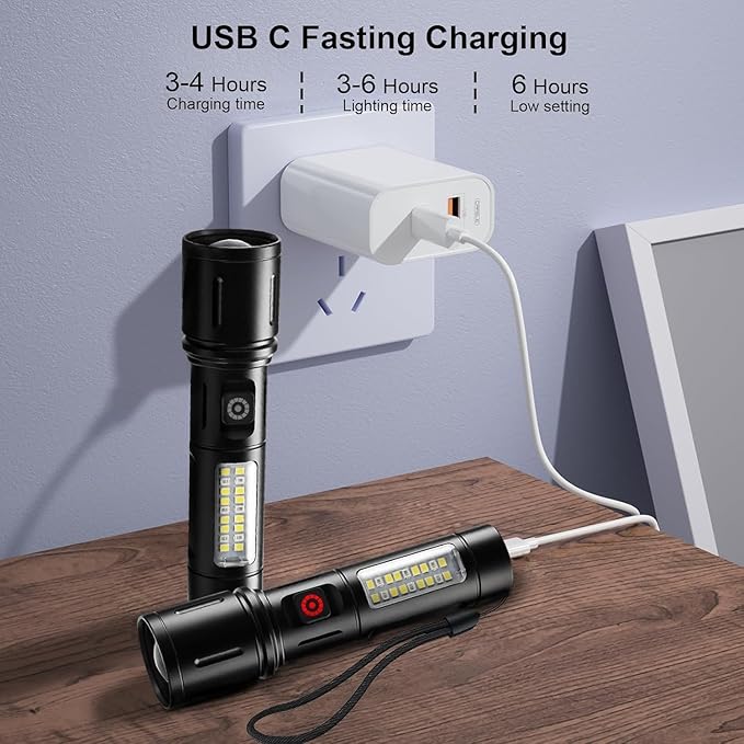 - [USB C Fast Charging] Built-in an rechargeable lithium-ion battery and equipped with more energy-efficient chips, the rechargeable flashlight battery powered working time is up to 3-6 hours. The USB C fast charging input achieves 30% reduction in charging time.
