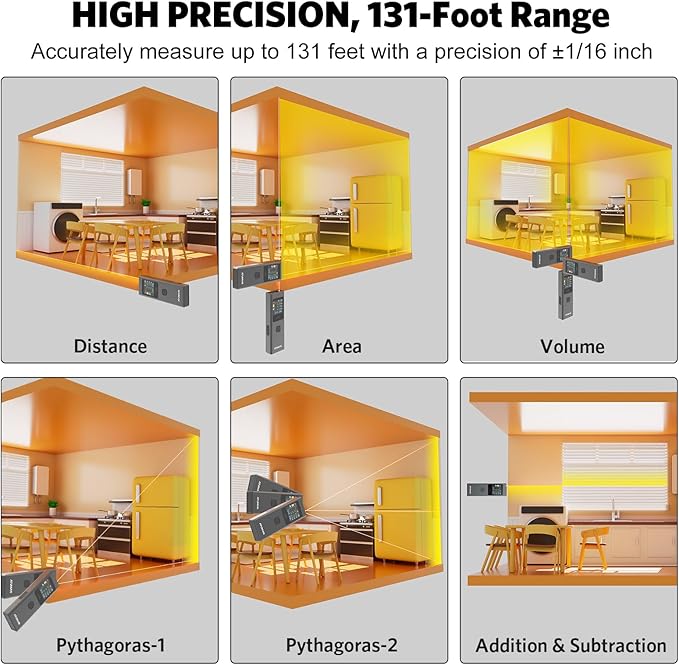 - High Precision: Accurately measure distances up to 131 feet with an impressive +/- 1/16 inch accuracy