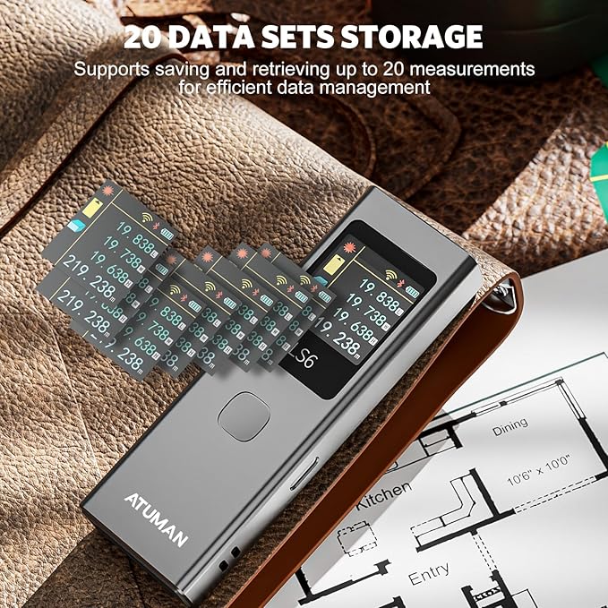 - 19 Measurement Functions: Includes angle, distance, area, volume, continuous measurement, Pythagorean theorem, and more, and can calculate automatically. Stores 20 data sets, with unit and language switching, and auto-off after 180 seconds for power-saving