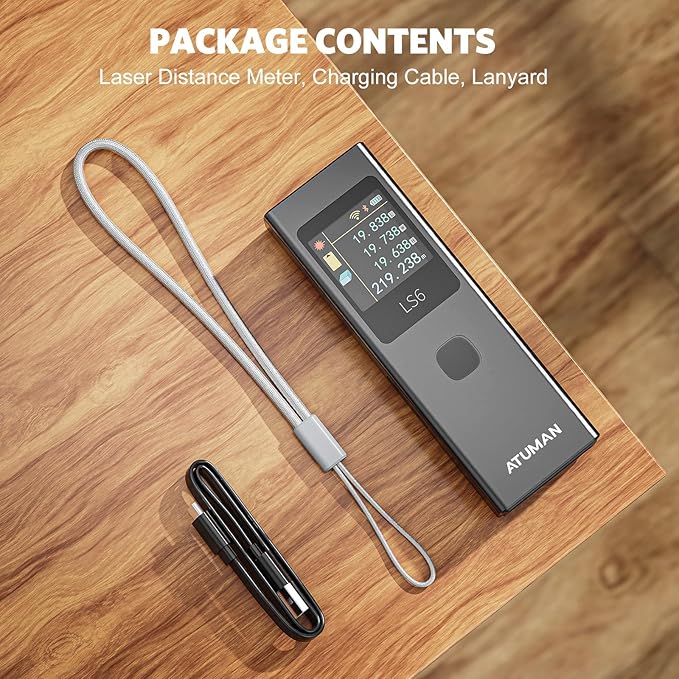 - Package Contents: Laser Distance Meter x1, Charging Cable x1, Lanyard x1, User Manual x1