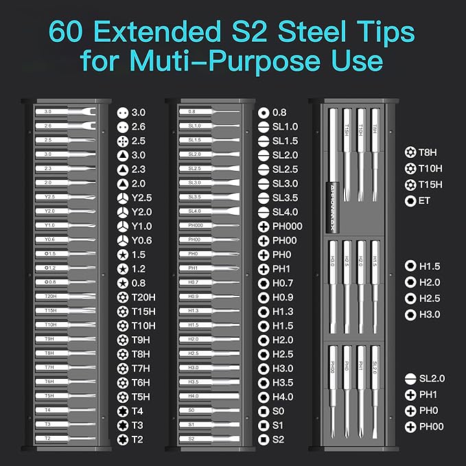 - 60-in-1 Metal Drill Bits: AM ARROWMAX Mini Electric Screwdriver comes with, 59 screwdriver bits and one extension head, including Phillips screwdriver, star screwdriver and nut driver with hexagonal shaft thickness of 4mm (0.155 inches). These versatile bits are designed to help you handle any screw-related task, even in unforeseen circumstances.