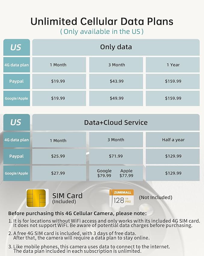 - 4G SIM Card & No WiFi Needed & Unlimited Cellular Data Plans : This 4G LTE cellular security camera outdoor is for locations without WiFi access and only works with its included 4G SIM card. It comes with 3 days of free trial data, a data plan is required afterward. does not require WiFi. It's perfect for monitoring areas like farms, ranches, job sites, backyards, gardens, campers, warehouses, cabins, vacation homes, RVs, and remote areas (NOT support Wi-Fi connections)