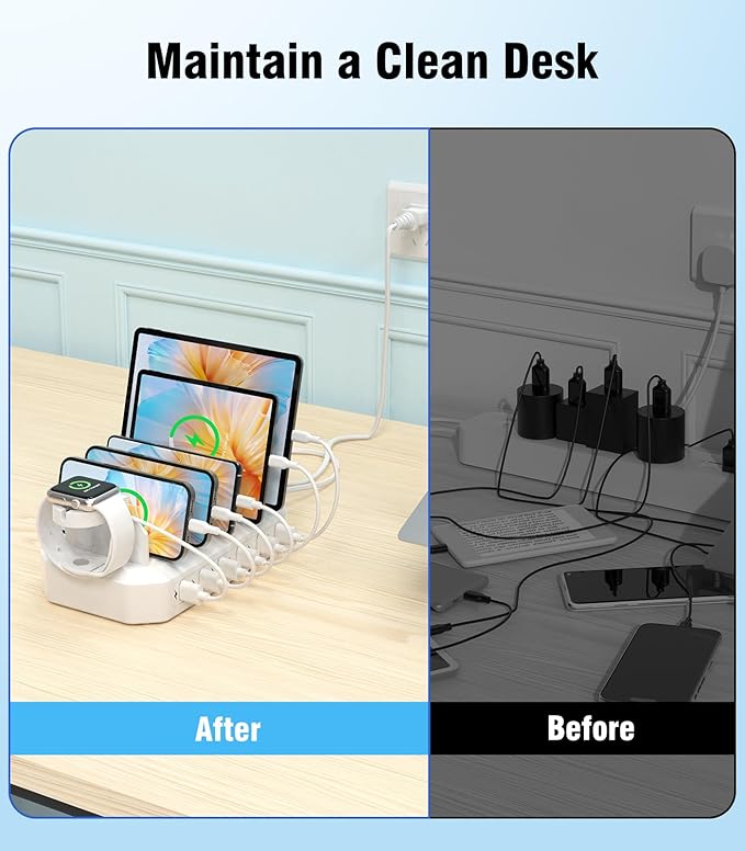 - ใConvenient and TidyใThis charging station for multiple devices is designed to power several gadgets simultaneously, making it a perfect solution for eliminating the clutter of tangled cables and multiple chargers.Multi usb charging station compact design not only saves space but also provides a neat and organized appearance. Ideal for maintaining a clean and orderly workspace, home, or travel setup, this usb c charging station simplifies your life by keeping your tech essentials in one convenient, organized location