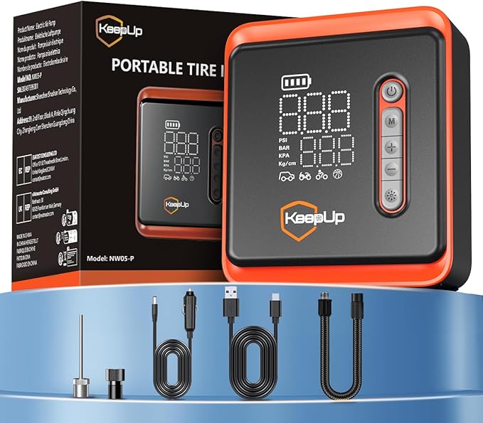 - 5X Fast Inflation Portable Tire Inflator:KEEPUP car tire pump equipped with a high-efficiency motor can provide 150 PSI max pressure and 34 L/min airflow. Inflate an E-bike in 30 seconds (10-20 PSI) and a car tire (205/55 R16) in less than 5 minutes, 5x faster than other car tire air pumps. Additionally, a 11.5ft power cord car charger included for added convenience.