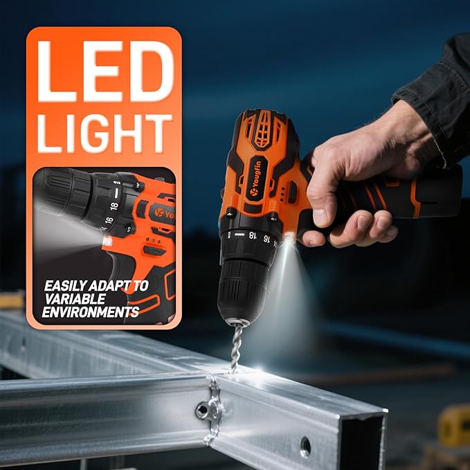 - [3/8" Chuck & Work Light]Enjoy a secure grip and comfortable handling with Yougfin power tools. The 3/8" keyless chuck provides excellent bit retention, while the molded handle ensures a comfortable grip. The built-in LED light facilitates work in dark areas or corners.