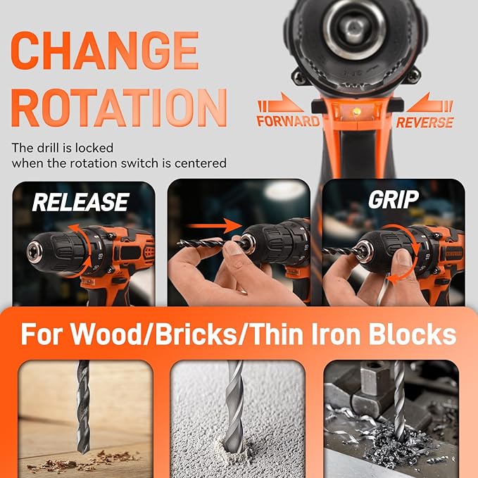 - [Multi-Function Precision Control]Features 18+1 torque settings and dual-speed control (0-450 RPM / 0-1500 RPM). The low-speed mode handles delicate screw driving while high-speed drilling penetrates wood/metal. Comes with essential accessories for easy task completion.