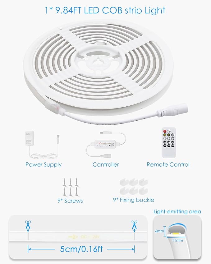 - 【Flexible & Easy to Install】This COB LED tape light is made of silicone structure on the outer layer, flexible and bendable, durable and wear-resistant, when the light strips are 5cm/0.17ft apart, the cutting mark will appear, you can cut it according to your needs. Then use the mounting accessories with 1.5M extra long charging cable to make your installation easier. Please waterproof the adapter and the end of the strip during installation!!!