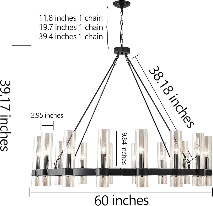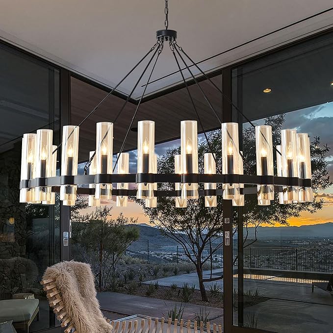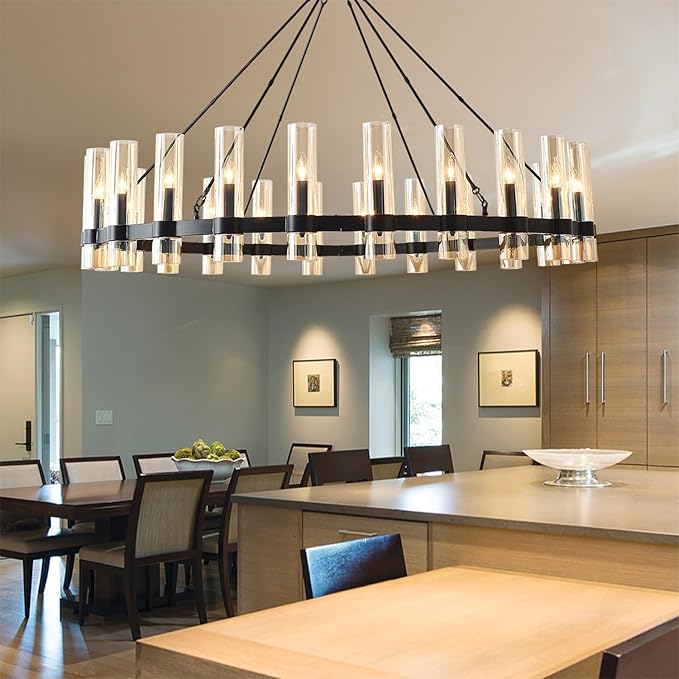 - EXQUISITE DESIGN: Round chandelier it is made of solid matte metal, and the slender glass cylinder is fixed in place by unadorned metal belt, which is in a perfect balance state. 24 lamps provide 360 illumination coverage, and each bulb will glow like a flickering candle, making it a unique and eye-catching supplement for any family. The black paint and glass lampshade give it a classic and timeless feeling, while the double-layer design adds a touch of elegance.