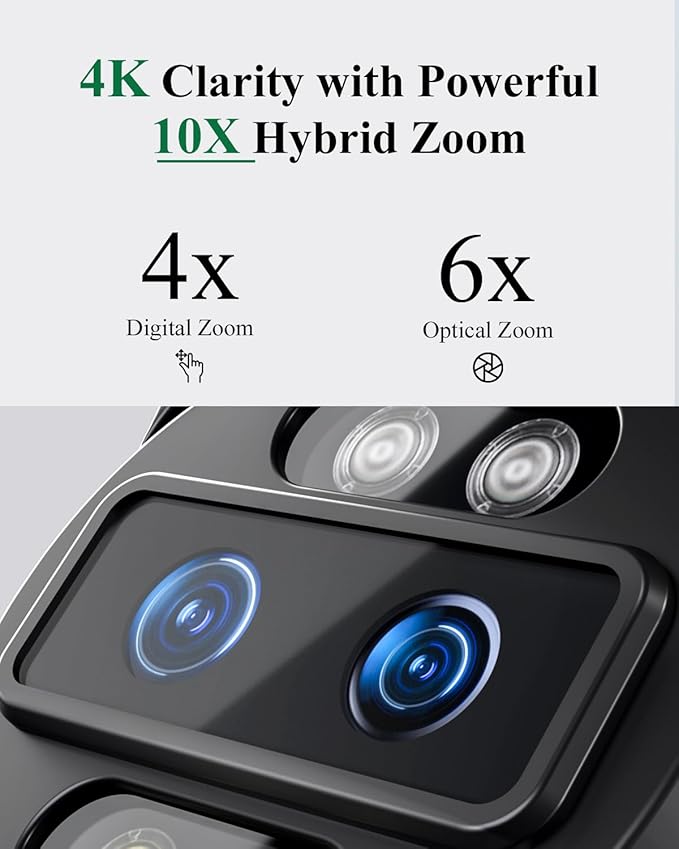 - 【10X Hybrid Zooml】 Capture every detail with stunning 4K clarity using our 6X optical zoom for close-ups and 4X digital zoom for even more detail. Easily switch between close-up and wide-angle views with a single click—something most cameras can't do. This feature ensures you get a clear and comprehensive view, making monitoring both large areas and fine details effortless.