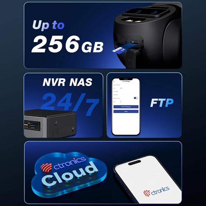 - 【Stay Connected Anytime, Anywhere】 With dual-band 2.4G and 5G WiFi, enjoy faster, more stable connections. Access live surveillance footage from your smartphone or computer, no matter where you are. Ensure your property’s security with up to 256GB Micro SD card storage and cloud options. Your data is always safe and accessible via FTP, NAS, and more.