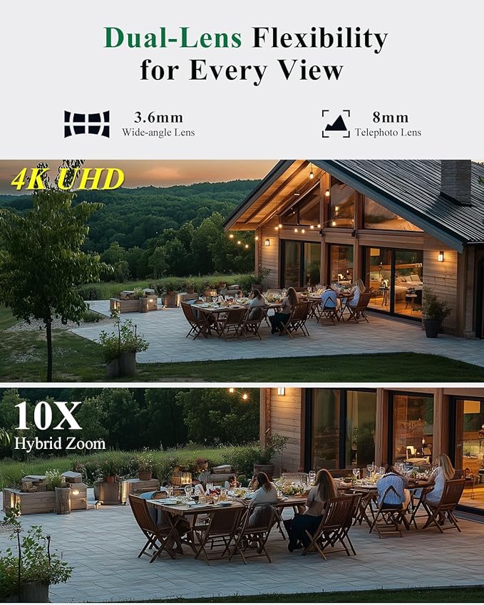 Ctronics [10X Hybrid Zoom] Dual-Lens 4K 8MP Security Camera Outdoor, Auto Tracking & Zoom, 2.4/5GHz WiFi, AI Human/Vehicle/Animal Detection, 256GB TF/Cloud/FTP/NAS Storage, Color Night Vision