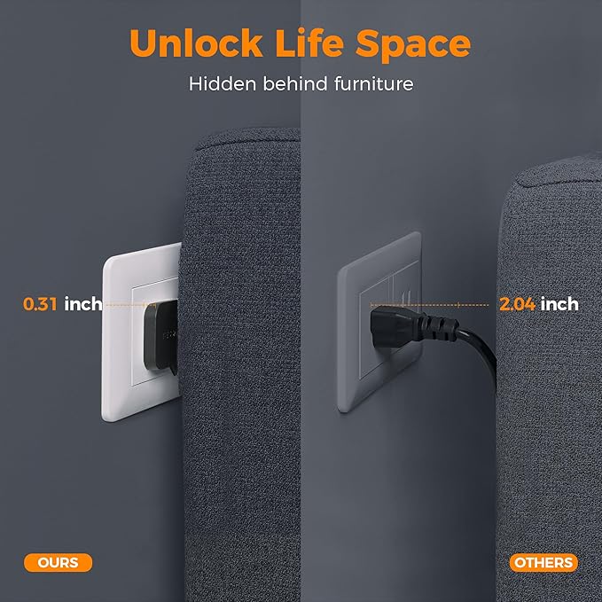 - 6 FT Flat Extension Cord: With only 0.31 in ultra thin flat head design, power strip flat plug can easily fit in tight spots and hide behind sofa, bed, nightstand or other furniture, sitting flush against the wall; 45° right angle design creates an extra space for other plug below without blocking