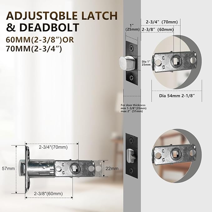 - 【Adjustable Backset】 Adjustable deadbolt & latch: 60mm (2-3/8") or 70mm (2-3/4") with square corner striker. Fits door thickness: 35mm to 51mm (1-3/8" or 2").
