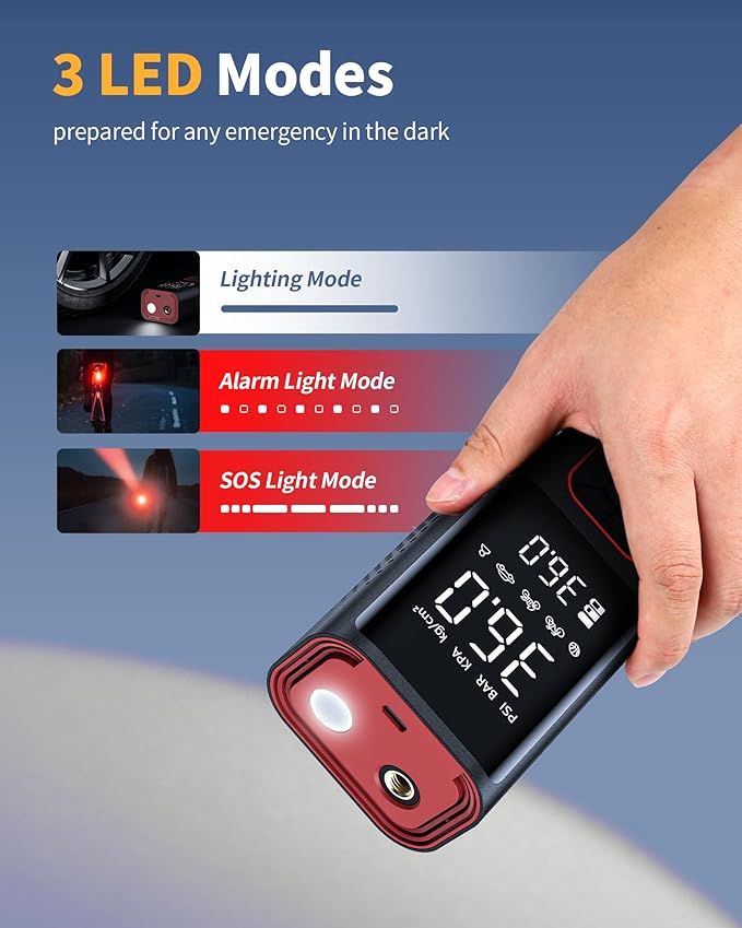 - BRIGHT LED LIGHT: Being multipurpose, it is more than a car air pump. On the top of this tire pump is a LED light providing convenience for you to inflate and change tires in the dark. There are 3 modes of LED light to facilitate use in dark environments: flash light, alarm light, and SOS light. This car air compressor is definitely a must-have in your car!