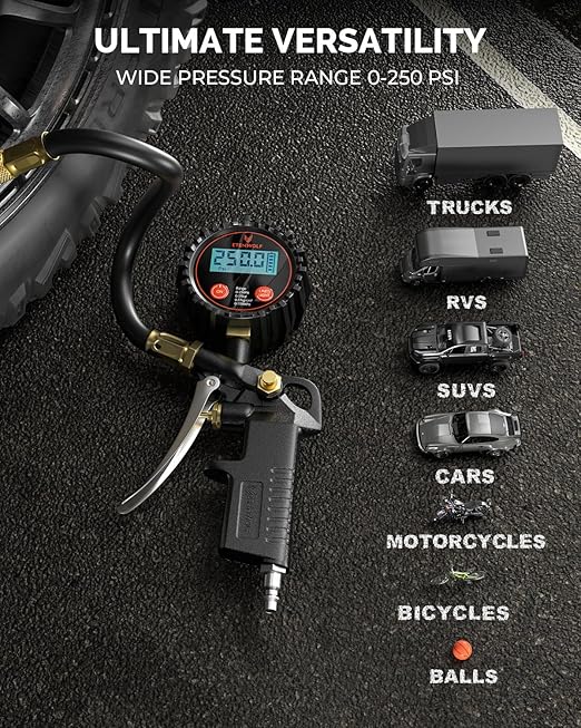 - WIDE PRESSURE RANGE 0-250 PSI: ETENWOLF's digital tire pressure gauge can accurately measure tire pressure for a variety of vehicles, including cars, trucks, SUVs, RVs, motorcycles, bicycles, and more