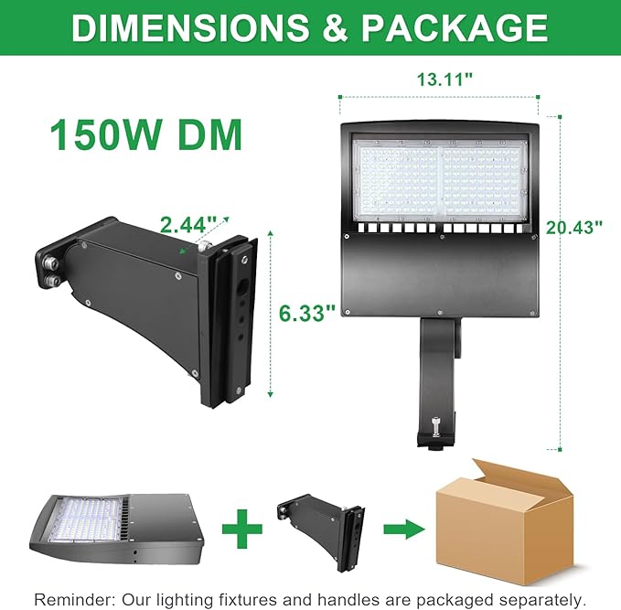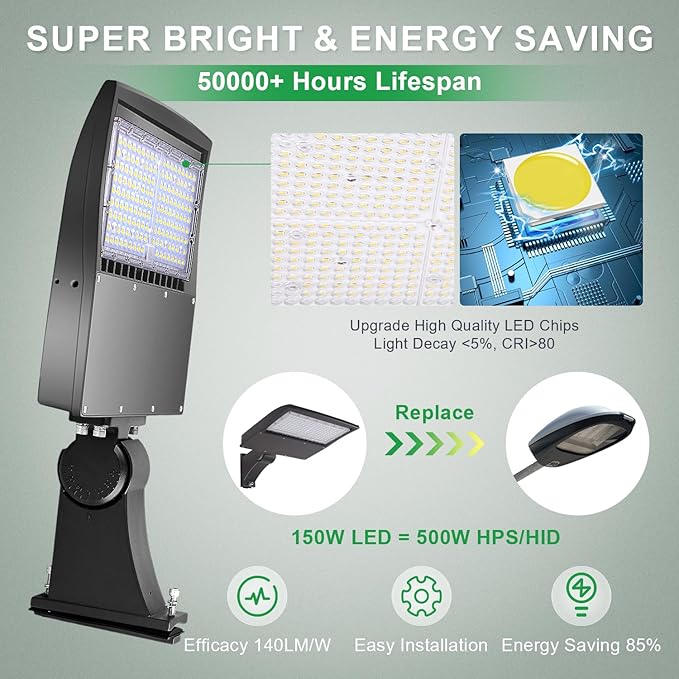 - 🌞【Ultra Bright & Energy Saving】-This 150W LED Parking Lot Light Adopting advanced SMD 3030Chips, provides 21000 lumen output and bring 140lm/w high efficiency Ideal substitution for 500W HPS/MH traditional lights. Compatible with AC 200-480V, The TypeⅢ distribution ensures expansive coverage, slashing your electricity bill by a staggering 80%. CRI>80 5000K color temperature of lighting is a nice choice for street light illumination, Anti-shock, anti-moisture, no glare, protecting your eyes.