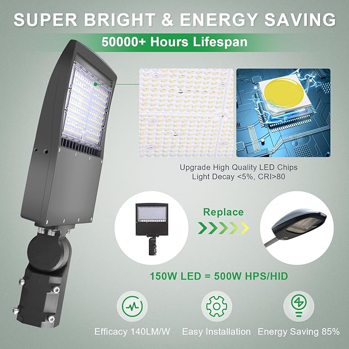 - 🌞【Ultra Bright & Energy Saving】-This 150W LED Parking Lot Light Adopting advanced SMD 3030Chips, provides 21000 lumen output and bring 140lm/w high efficiency Ideal substitution for 500W HPS/MH traditional lights. Compatible with AC 200-480V, The TypeⅢ distribution ensures expansive coverage, slashing your electricity bill by a staggering 80%. CRI>80 5000K color temperature of lighting is a nice choice for street light illumination, Anti-shock, anti-moisture, no glare, protecting your eyes.
