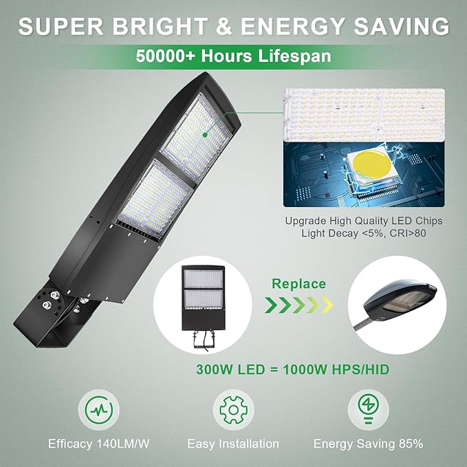 - 🌞【Ultra Bright & Energy Saving】-This 300W LED Parking Lot Light Adopting advanced SMD 3030Chips, provides 42000 lumen output and bring 140lm/w high efficiency Ideal substitution for 1000W HPS/MH traditional lights. Compatible with AC 200-480V, The TypeⅢ distribution ensures expansive coverage, slashing your electricity bill by a staggering 80%. CRI>80 5000K color temperature of lighting is a nice choice for street light illumination, Anti-shock, anti-moisture, no glare, protecting your eyes.