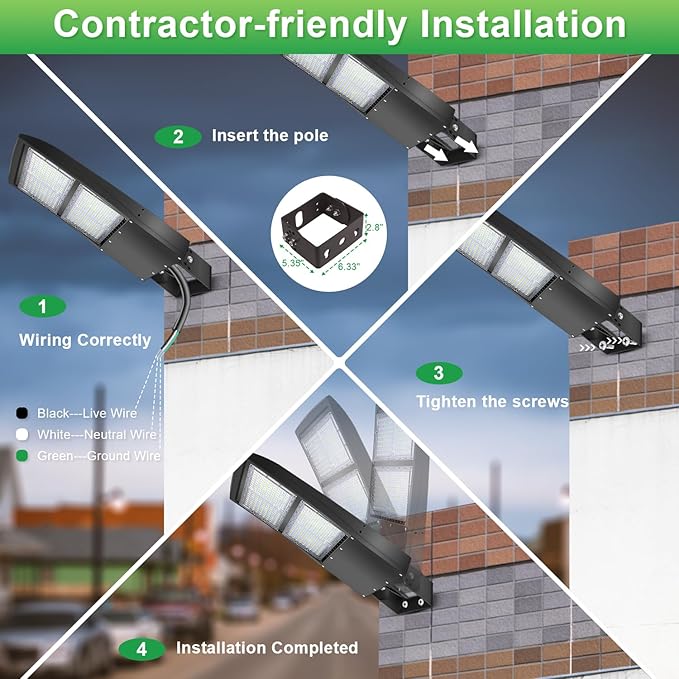- 🚀【Built to Endure】-The UL/DLC Listed led street area lights are made of Die-casting aluminum body with polyester powder-coated finish. The scientific design helps the exterior light post top to dissipate better, achieve the best use of the led lighting. IP65 waterproof and Dimmable: 1-10V, with a 20KV surge protection device built-in, wet environment, sandstorms, snowstorms, and harsh weather conditions.