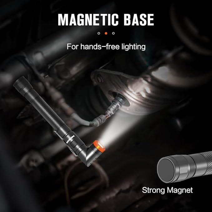 - *90-Degree Rotating Head: The unique design of the flashlight allows the head to rotate 90 degrees, enabling users to adjust the beam angle for precise lighting control. It also with a strong magnetic tail cap , can attach to any iron objects . This feature is particularly useful for hands-free tasks or for illuminating specific areas