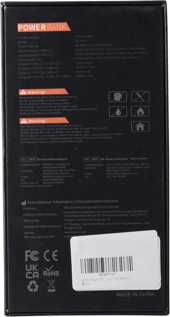 - [Universal Compatibility]: The AsperX 100W power bank is compatible with a wide range of devices and supports mainstream fast charging protocols such as PD3.0, QC3.0, PPS, AFC, and UFCS. It can quickly charge phones, laptops, tablets, game consoles, and cameras. Note: We've addressed the issue of low-power products not being compatible, such as low-power fans, headphones, and smartwatches. Simply press and hold the power button to enter low-power mode (the "A" on the screen changes from white to red).