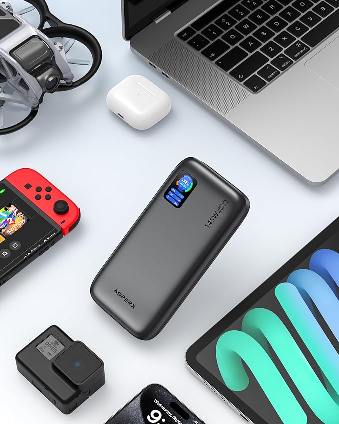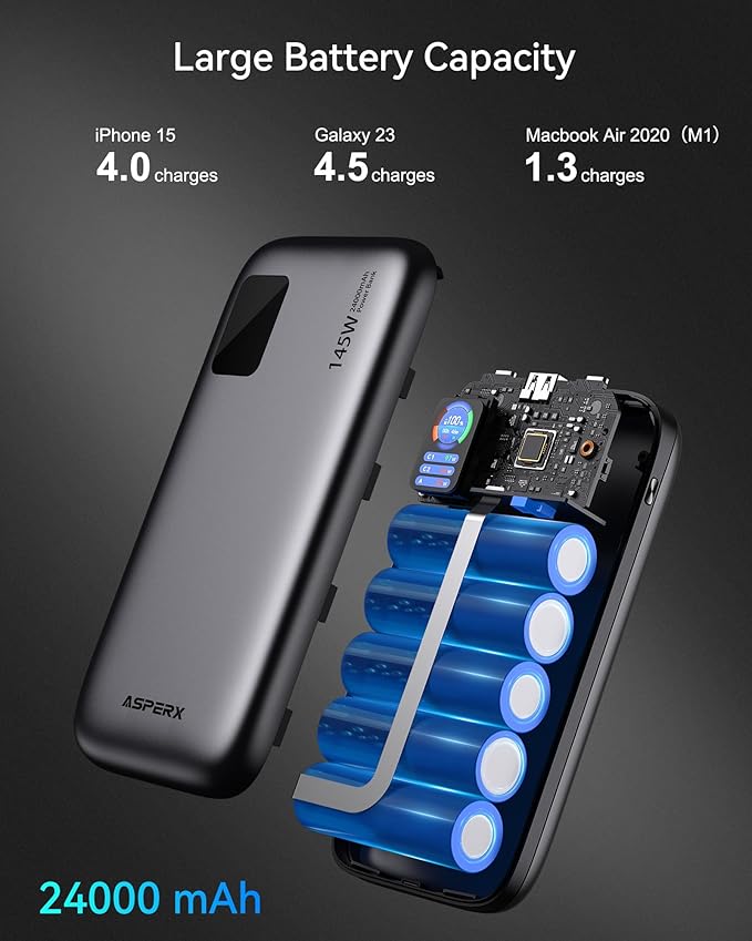 AsperX Laptop Power Bank,24,000mAh 145W PD 3.1 Fast Charging Portable Charger, TFT Smart Display USB C Battery Pack(86.4Wh) for MacBook/iPhone 17/Dell XPS/Galaxy S25/Steam Deck/ipad (Flight-Approved)
