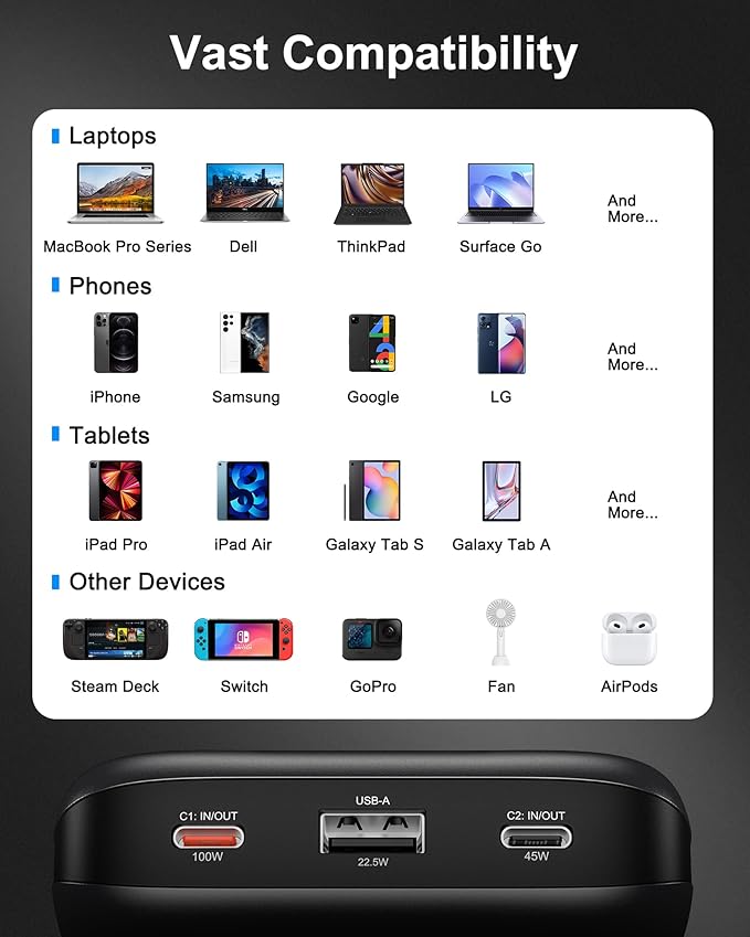 - [Two-way Fast Charging]: The dual USB-C input and output ports efficiently deliver 100W and 45W to your devices, respectively. Using a 100W or higher charging adapter, the power bank itself can be fully charged in just 1.8 hours. This is three times faster than other standard power banks. (Use the included 5A USB-C to USB-C cable or another certified 5A cable for optimal performance and device compatibility.)