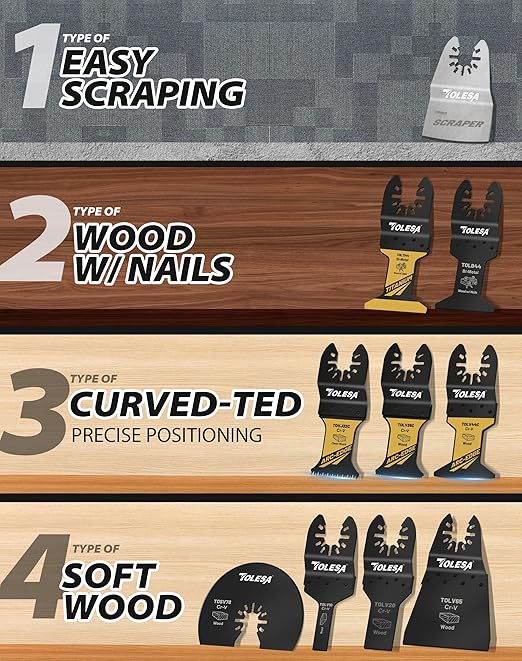 - 【Titanium Enhanced Durability】TOLESA oscillating tool blades feature titanium-coated teeth, providing twice the lifespan of standard bi-metal blades. Our oscillating saw blades blades ensure long-lasting performance and fewer replacements when cutting wood and metal.