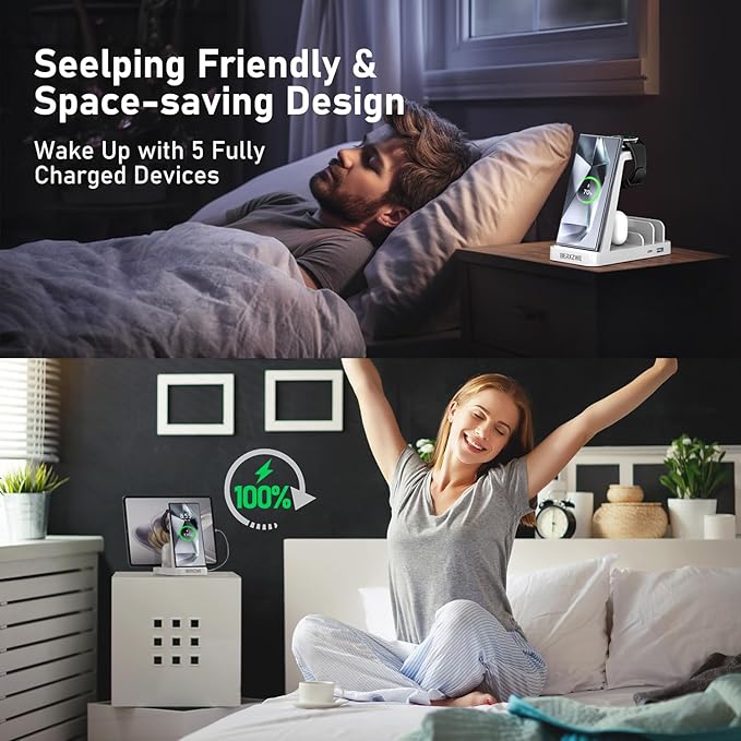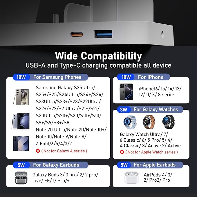 - 【Widly Compatibility】Our charging station works for almost all samsung android and iphone that support wireless charging (NOT FOR Galaxy A and Flip Series). Such as S25 Ultra/S25/S24 Ulta/S23/S22/S21/S20/Note20/10/9/8/7, Z Fold 7/6/5/4/3/2, iPhone 16/16e/16 Plus/16 Pro/16 Pro Max/iPhone 15/15 Plus/15 Pro/15 Pro Max/iPhone 14/14 Pro Max/14 Plus/14 Pro/iPhone 13/13 Pro/13 Pro Max/13 Mini/12/12 Pro/12 Pro Max/12 Mini/11/11 Pro/11 Pro Max/SE/XS MAX/X/XR/8/8 Plus