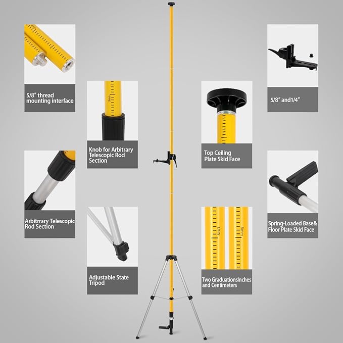 - 【Product Specifications】 The maximum height of this telescopic pole is 3.7 metres / 12 feet. The length of each standard pole is 60cm, and the applicable units on the pole are inches and centimetres. This laser level pole is suitable for any workplace and can be easily installed between the floor and ceiling. Package included: 4 x Standard Pole , 1 x Telescopic Pole (with Spring-Loaded Base), 1 x Bracket (with 1/4"-20 Male Thread), 1 x 5/8"-11 Screw Adapter, 1 x Tripod, 1 x Transport Bag.