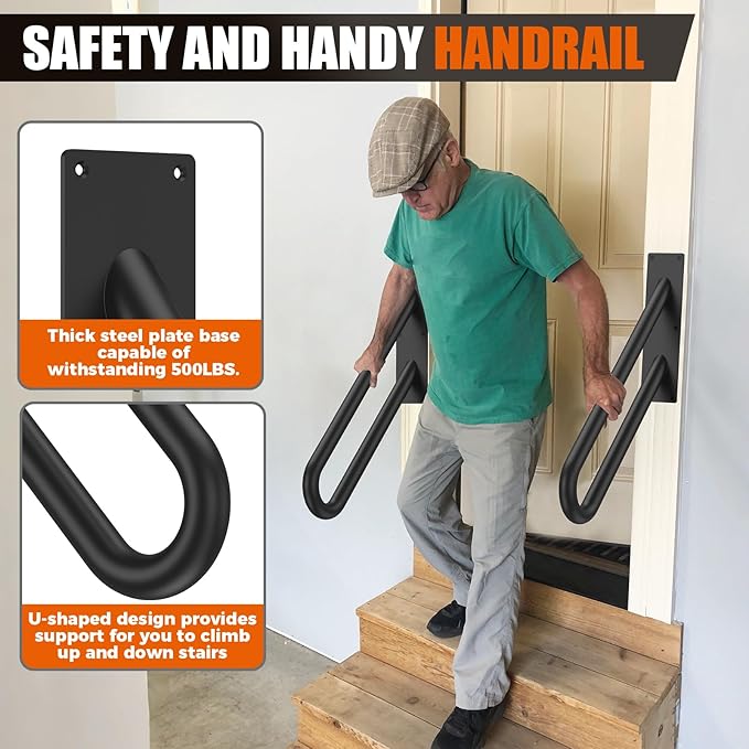 - Friendly Curved Handle: Our staircase handrails feature a non slip U-shaped design with a black polished surface. The 45 ° tilt angle is suitable for 1 to 3 steps, providing safe support for the elderly, children, disabled family members, and post-operative personnel.