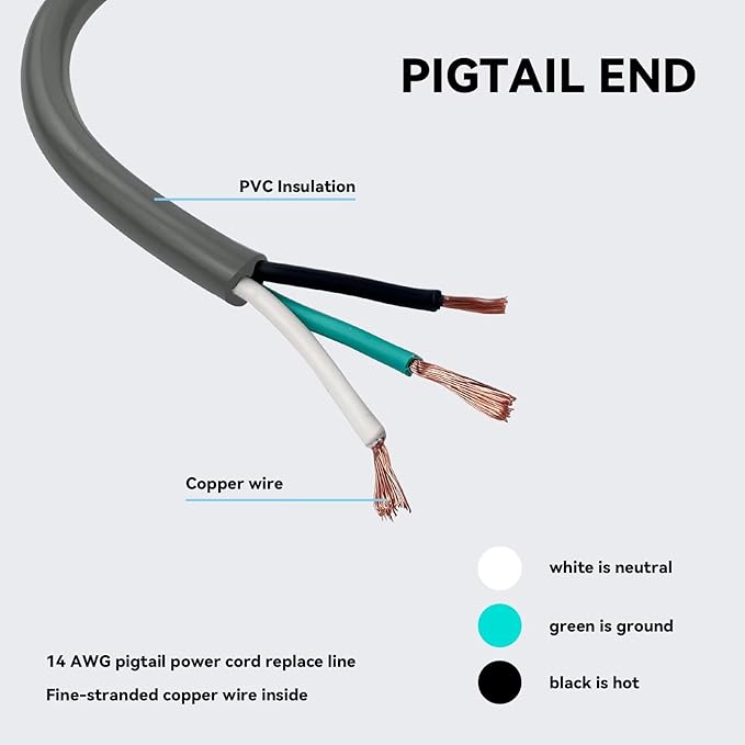 - Pigtail End - 14/3 replacement power cord NEMA 5-15P male to bare end ( ONE END ), which has open wiring on the other end.