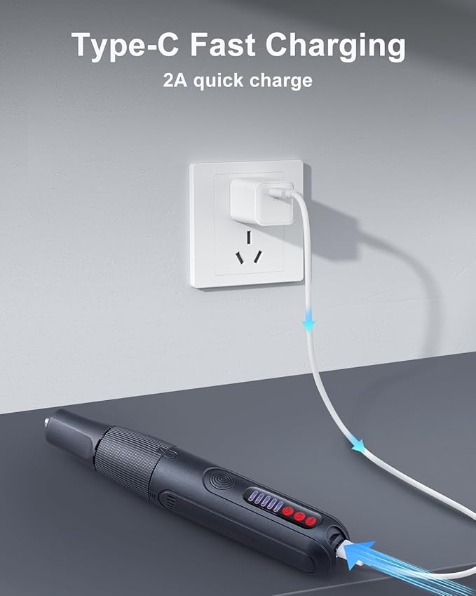 - Fast Charging & Long-lasting Battery - Growneer rechargeable rotary tool equipped with an 3-level power indicator, you can easily monitor the remaining battery life. The lithium-ion battery provides up to 30% longer usage time than standard batteries. The Type-C charging port supports quick recharging, you can recharge your tool in a short time at home or even in your car. Also, the wireless design meets the needs of outdoor work, say goodbye to tangled wires and sockets