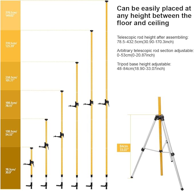 - Durable Laser Support Pole: Constructed from high-grade aluminum with a protective polyurethane coating, our multi-purpose laser pole is designed for indoor and outdoor use. Featuring five sections and slip-resistant, rubber-plated end pieces, this laser level tripod ensures reliable performance in any surveying or construction environment. It adjusts from a minimum height of 31” to a maximum of 13’8” when laser tripod fully extended.