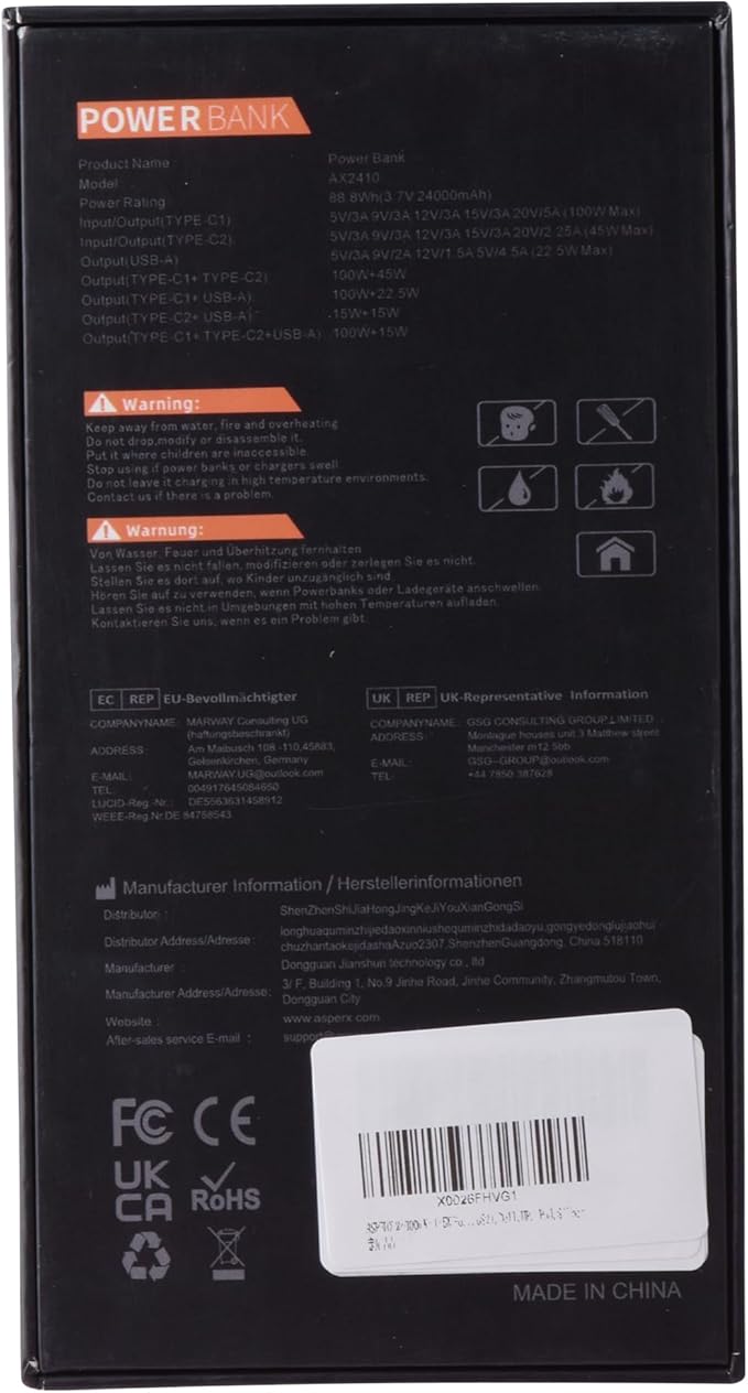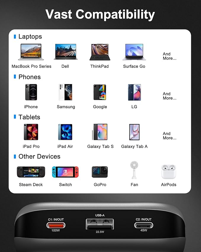 - [Universal Compatibility]: The AsperX 100W power bank is compatible with a wide range of devices and supports mainstream fast charging protocols such as PD3.0, QC3.0, PPS, AFC, and UFCS. It can quickly charge phones, laptops, tablets, game consoles, and cameras