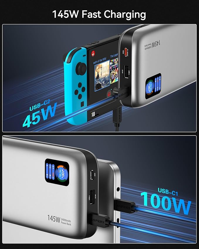 AsperX Laptop Portable Charger, 24,000mAh 145W Power Bank, TFT Smart Display, USB C PD 3.1 Fast Charging Travel Battery Pack (86.4Wh) for MacBook, iPhone 17/16,Dell XPS, Steam Deck(Flight-Approved)