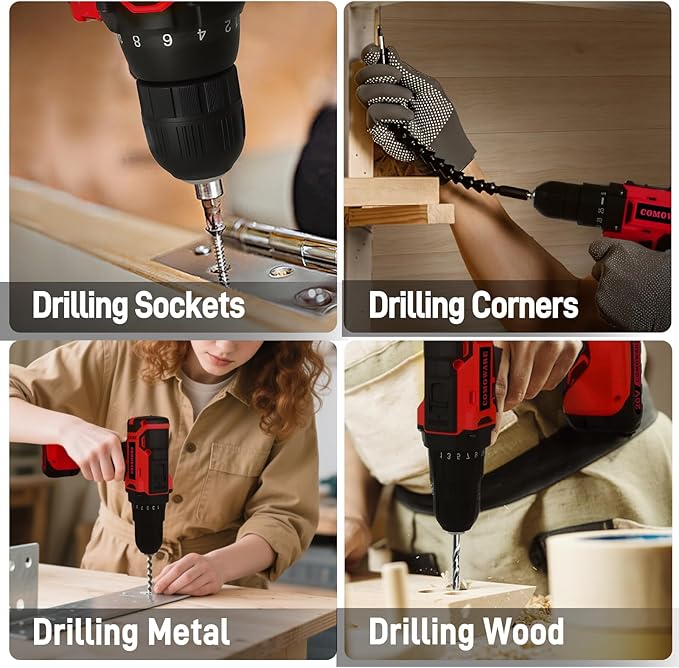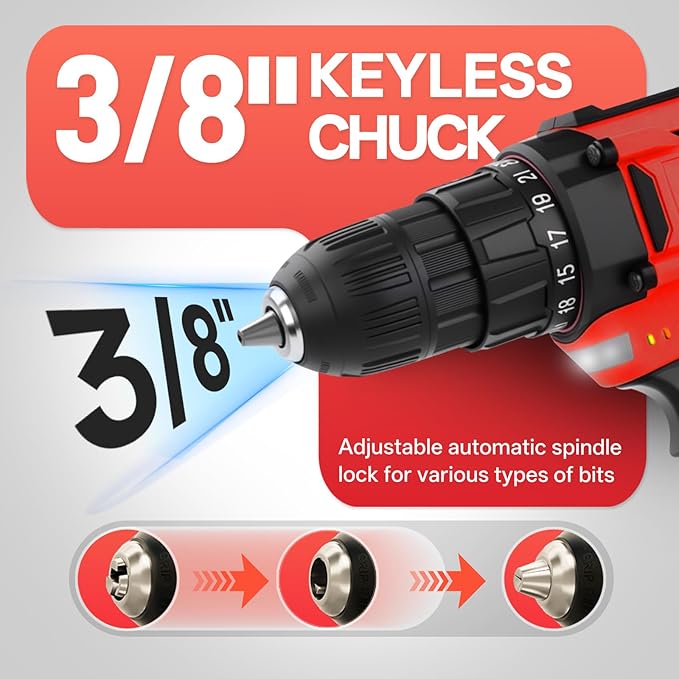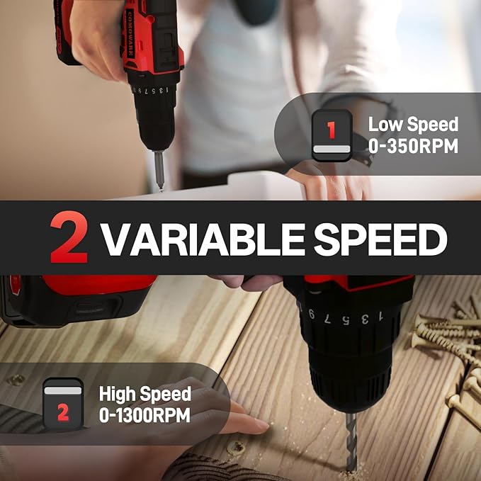 - [20V Cordless Drill with LED] The 20V cordless drill is powered by a 1500mAh lithium-ion battery. It features a 3/8" keyless chuck and a 25-position clutch for adjustable torque output to control screw/fastener depth, with maximum torque of 266 in-lbs. Dual-speed control (0-350 RPM & 0-1300 RPM) allows easy drilling speed adjustment.