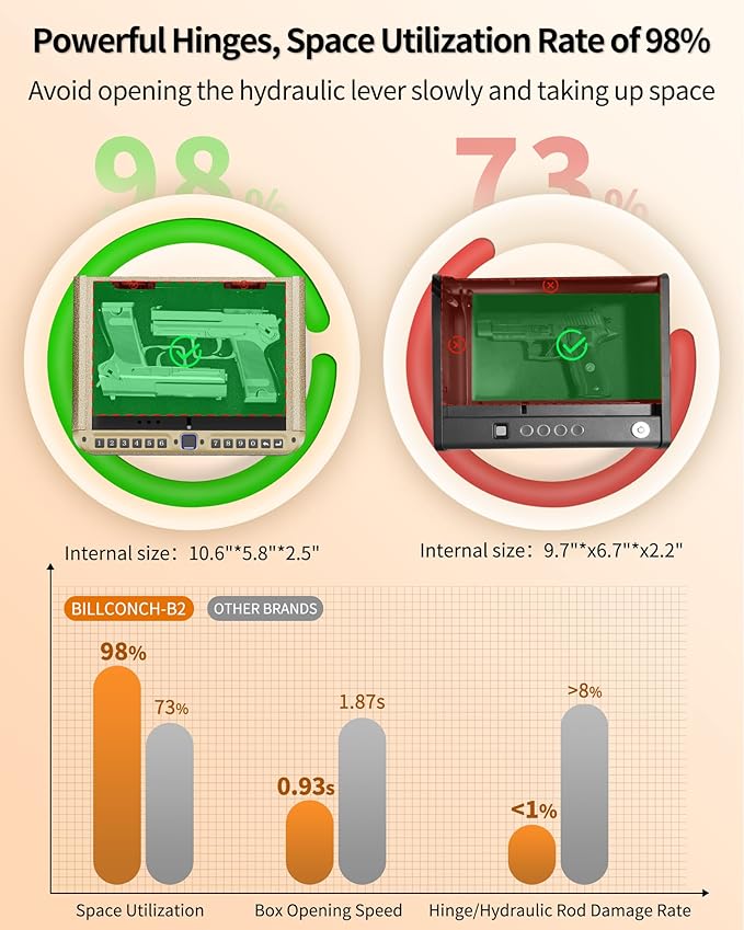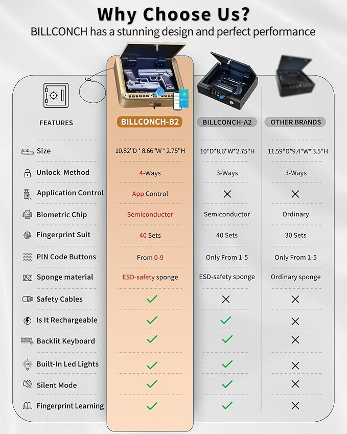 - 5-Star After-Sales Service: We are committed to providing top-notch intelligent gun safes to Protect your home! If you are not satisfied with the quality of the pistol safe product, or the results do not meet your expectations, please contact us through Amazon within the 365-day warranty period and we will provide you with exceptional service and support, including refunds or replacements and more. Rest assured that BILLCONCH's team of handgun safe professionals is always willing to help