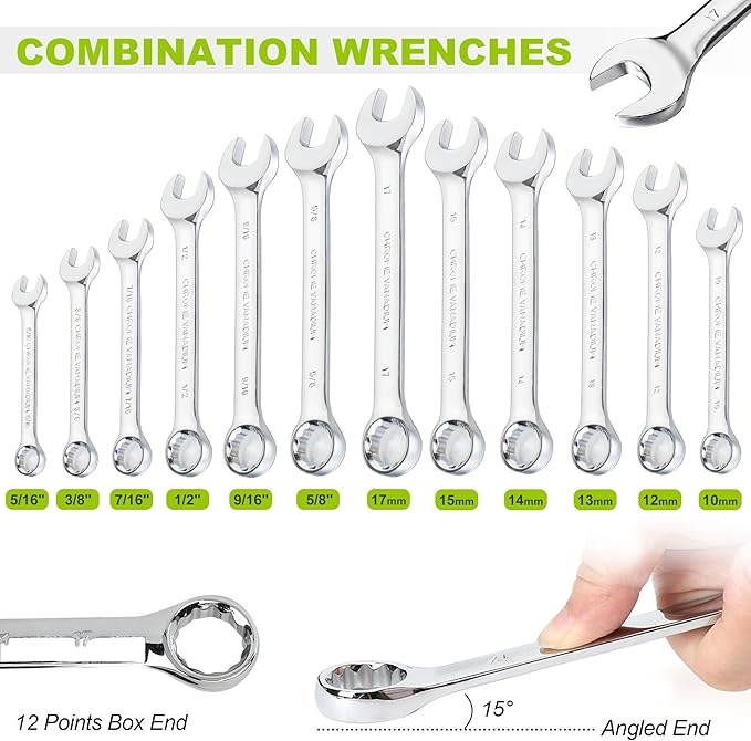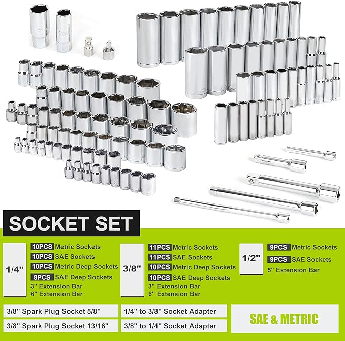 - Socket wrench set includes 1/2", 3/8" and 1/4" metric / SAE sizes to satisfy your general automotive repairs work. Ideal for wide application, such as car maintenance, motorcycle maintenance, furniture assembly, home maintenance work, equipment inspection and repair, etc.