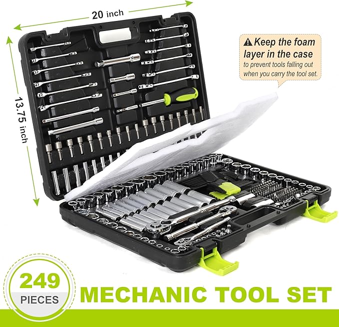 FASTPRO 249-Piece Mechanics Tool Set, SAE & Metric Socket Set, Include 1/2", 3/8" and 1/4" Drive Sizes