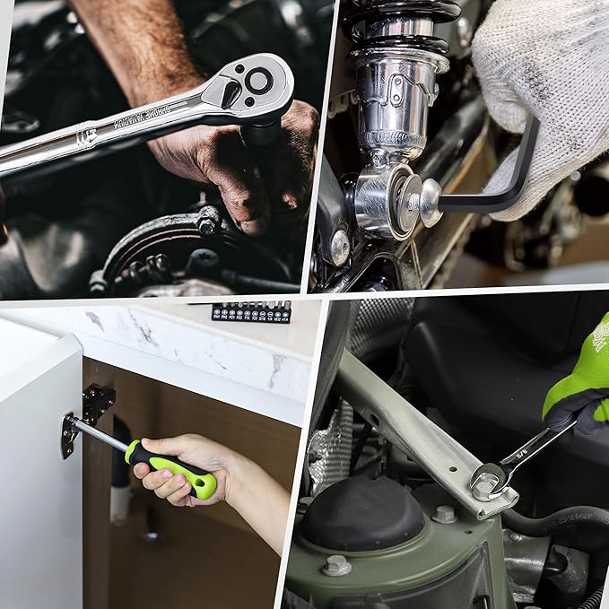 - 72-tooth ratchet handles allow for working better in tight spaces, reversible design allows your loosen and tighten fastener job without removing the socket. The quick release button helps you replace the socket without a tool.