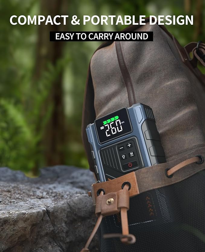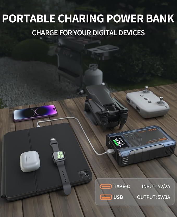 - VERSATILE POWERFUL JUMP STARTER - The jump box for car battery is a compact essential tool that features car emergency start, tire inflation, tire pressure detection, power bank and lighting function. With the jump box, you can easily handle roadside assistance such as dead battery or flat tire