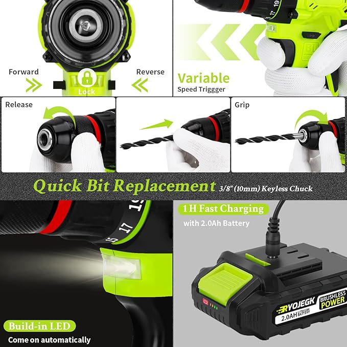 - 20V HIGH TORQUE BRUSHLESS DRILL - RYOJEGK Driver kit is equipped with 20V brushless drills. Compared with brush drills in the market, the cordless drills with advanced brushless motor technology can provide up to 50N.m (442in-lbs) of torque, which is much longer service life and higher efficiency than brush motors, and are equipped with a 24+1 clutch system and a 2-speed gear change function, Precise adaptation to various occasions