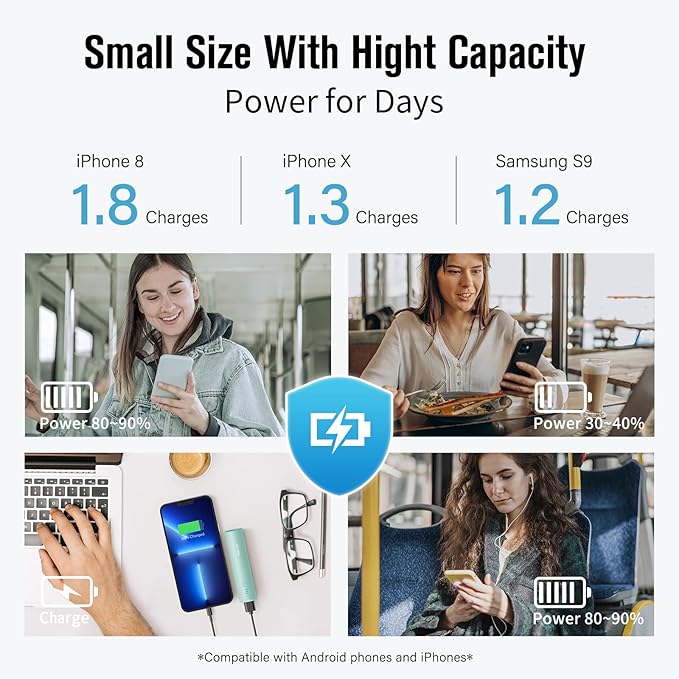 - 3A Fast Charging: The 5000mAh Power Bank Fast Charging for devices (up to 5V/3A), compatiable with iPhone 14/13/12/11/X/XR/, Samsung Series.