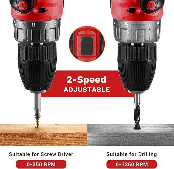- 【20 V Electric Drill】This electric drill cordless has two Variable Speed (0-350/0-1350 rpm) and 18+1 torque settings