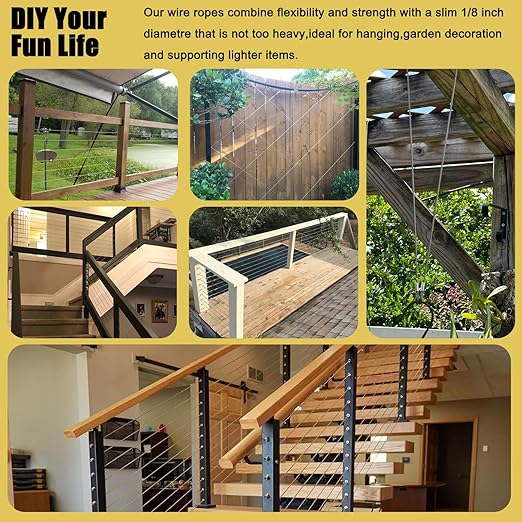 - 【1/8" Cable Kit Widely Useful 】Suitable for Sun Shade Hardware Kit ,Metal Wire for Garden Trellis, Garden Wire for Climbing Plants,Clothesline Wire,String Light Hanging Kit Outdoor, Globe Lights Hanging,Sun Sail Hardware Kit,String Light Suspension Kit , Curtain Cable Wire System,Guide Wire for Outdoor String Lights ,Outdoor Applications of Tent Rope, Deck Cable Railing and etc.