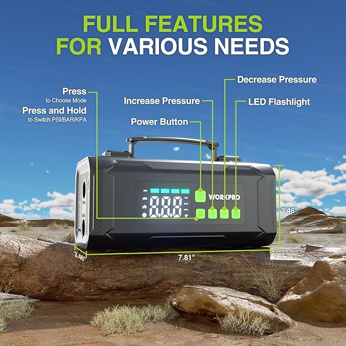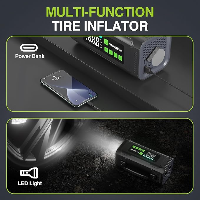 - Emergency Design & Compact: More than just an air compressor, it comes with built-in LED lighting (SOS, normal, strobe) for low-light situations and emergencies. Doubles as a power bank to charge your devices on the go. Its compact size also makes it easy to carry and store, so you can take it anywhere. This tire inflator is a practical tool for any road trip, camping adventure, or daily use
