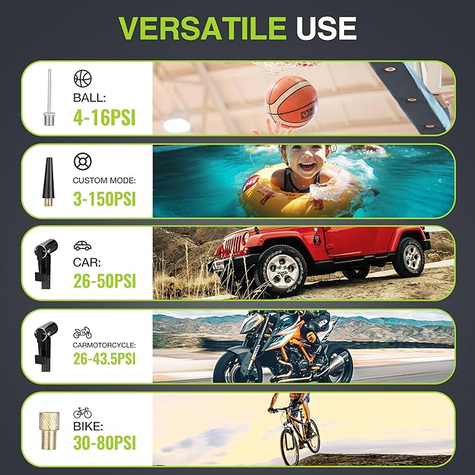 - Fast Inflation Speed: This tire inflator, equipped with a powerful motor that works 3X faster, can inflate car tires (30-36 PSI) in just 1 minute. It's a portable inflator suitable for cars, bikes, motorcycles, and balls, offering greater convenience for daily life and travel
