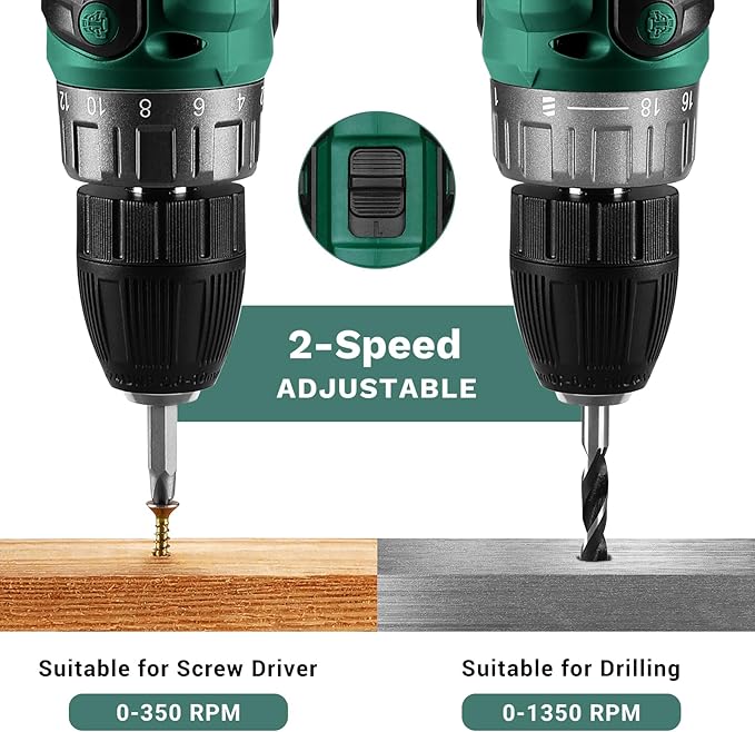 - 【20 V Electric Drill】This electric drill cordless has two Variable Speed (0-350/0-1350 rpm) and 18+1 torque settings
