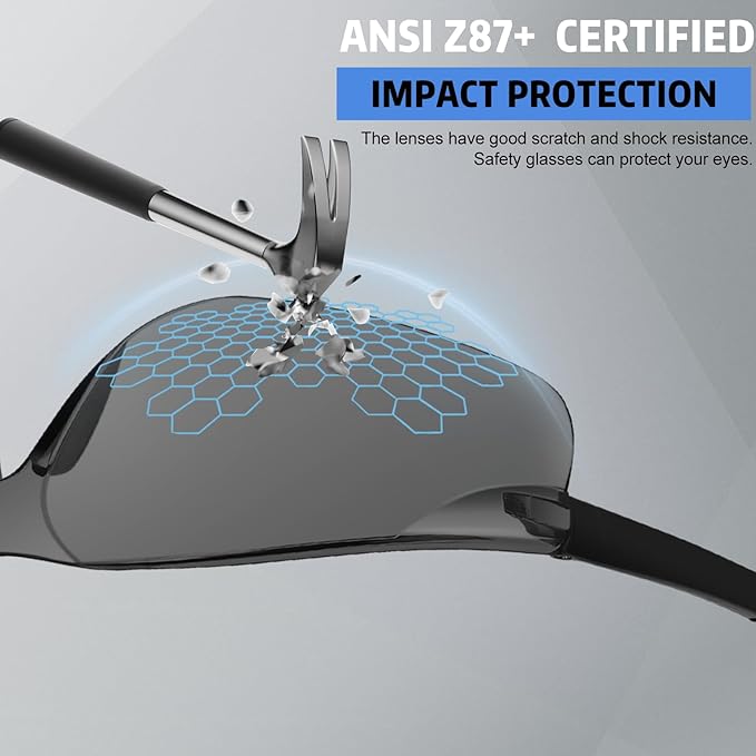 - ANSI Z87.1 STANDARD: Our glasses meets ANSI Z87+ and are tested by qualified apparatus to scientifically verify their safety. Meets the High Impact Requirements of ANSI Z87.1. Our safety protective glasses offer all-around eye protection from flying debris and particles